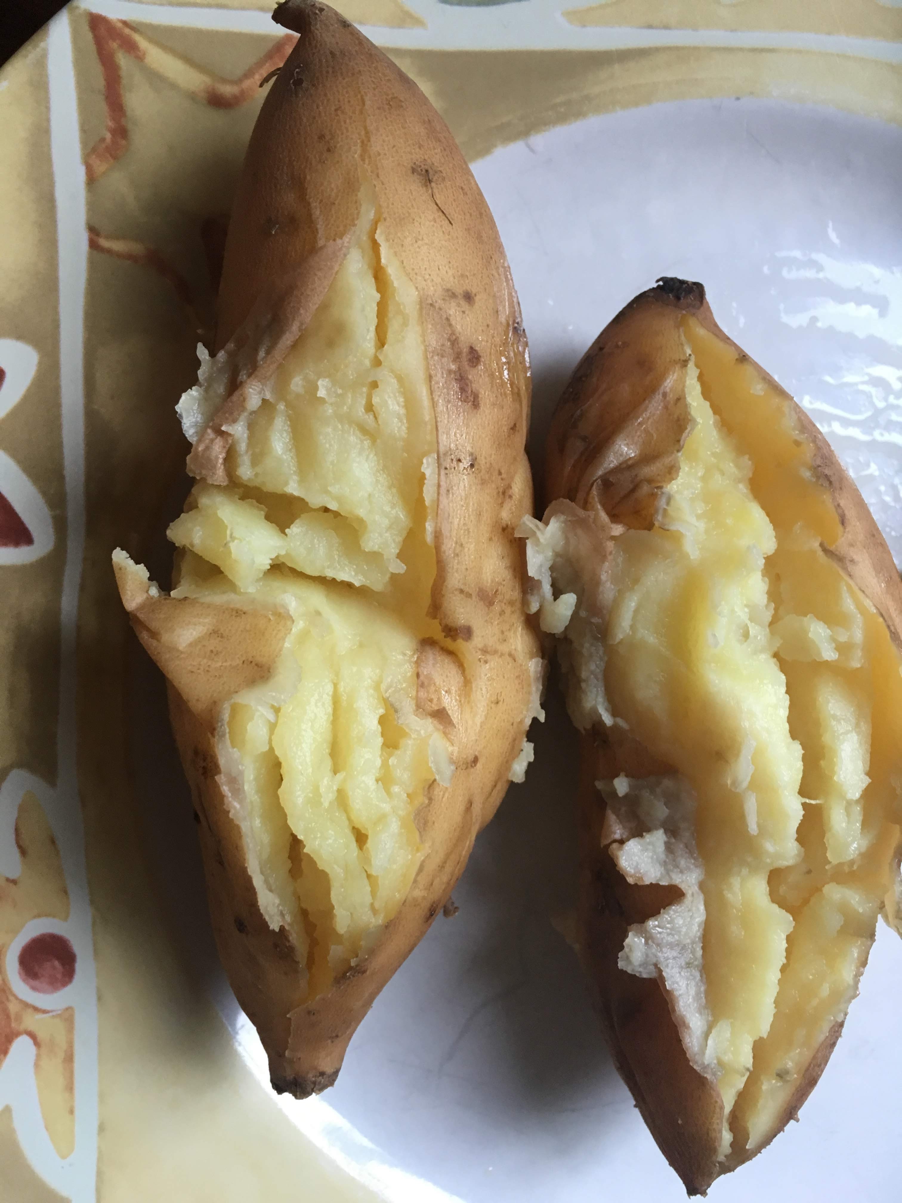 Fill Instant pot with water. Poke holes in tubers and place on steam rack. Cook at High pressure 20min or 16 min for small ones. Allow natural release 15min, then press venting. Top with butter flavoured coconut oil and sea salt (the oil is not salty like ghee) or ghee