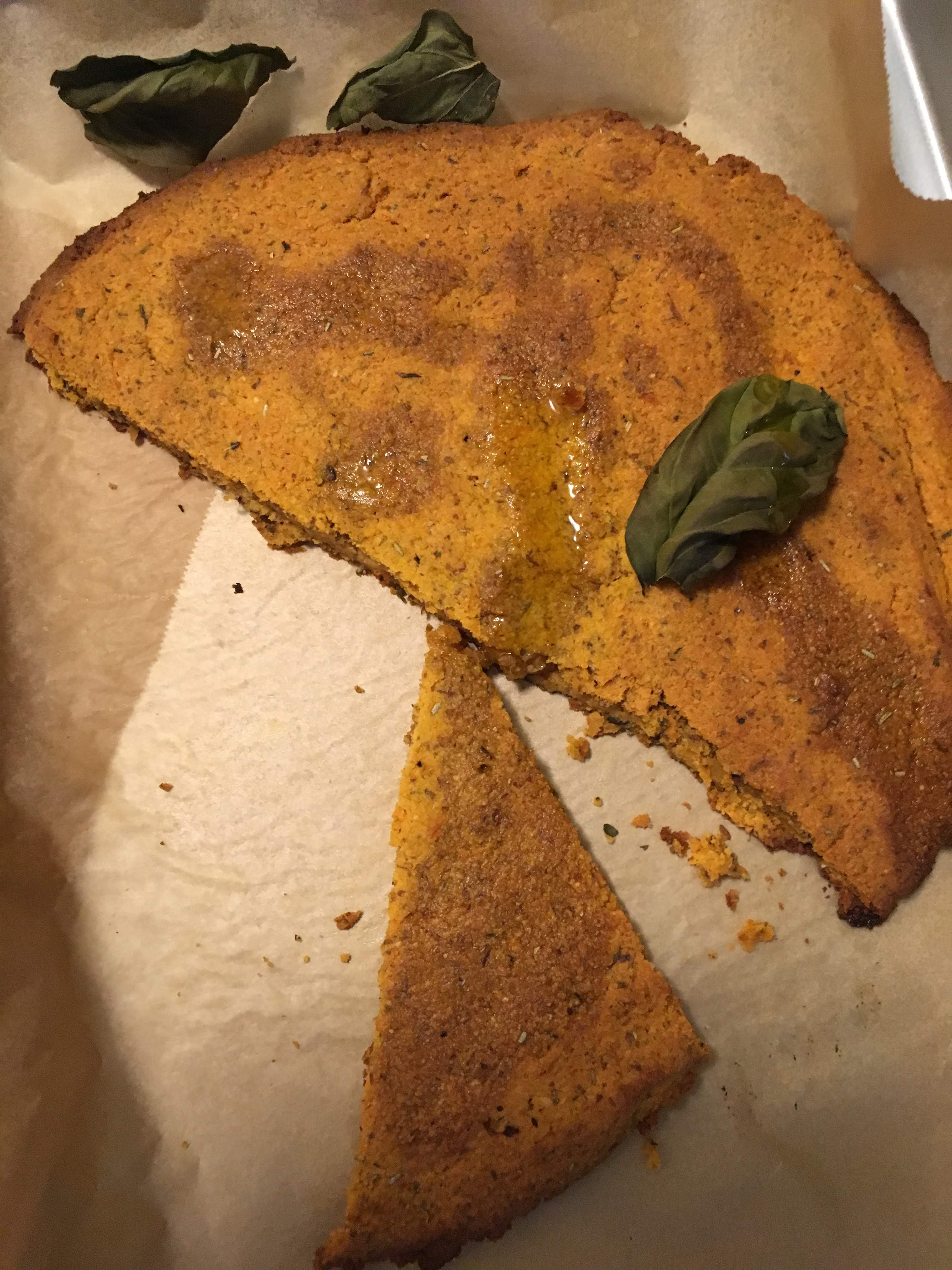 place the sweet potato in a food processor with the herbs and oil and pulse , stopping and scraping down the sides until homogenous. line a sheet pan with parchment paper and press the dough into it using your hands or the bottom of a cup. Its ok if its a bit sticky at first. bake for 45 minutes or so until golden brown. Let it cool well before slicing. Serve with favorite dips or drizzled in basil infused olive oil or melted butter- flavor coconut oil ghee or olive oil.