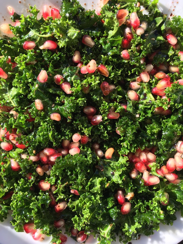 Pour oil and sea salt over kale, massage kale with hands for 5 minutes to soften it up and make it easier to digest and more pallateable. Drizzle with pomegranate dressing and mix well. Garnish with pomegranate (the juicy star of this salad) and toasted sesame seeds.