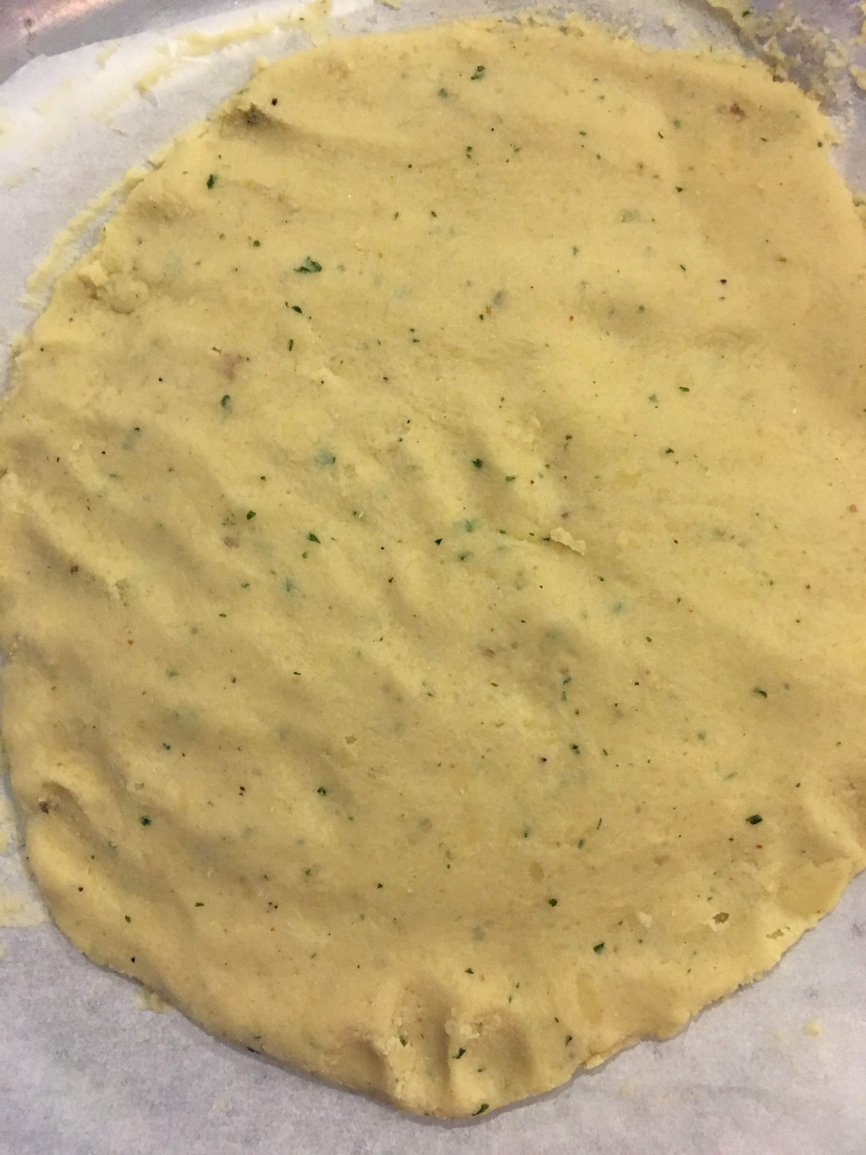 Preheat oven 420 degrees. In a Food processor process all ingredients, stopping and scraping down the sides. Line a baking sheet or pizza pan with parchment paper and press the dough down, it will be bit sticky.