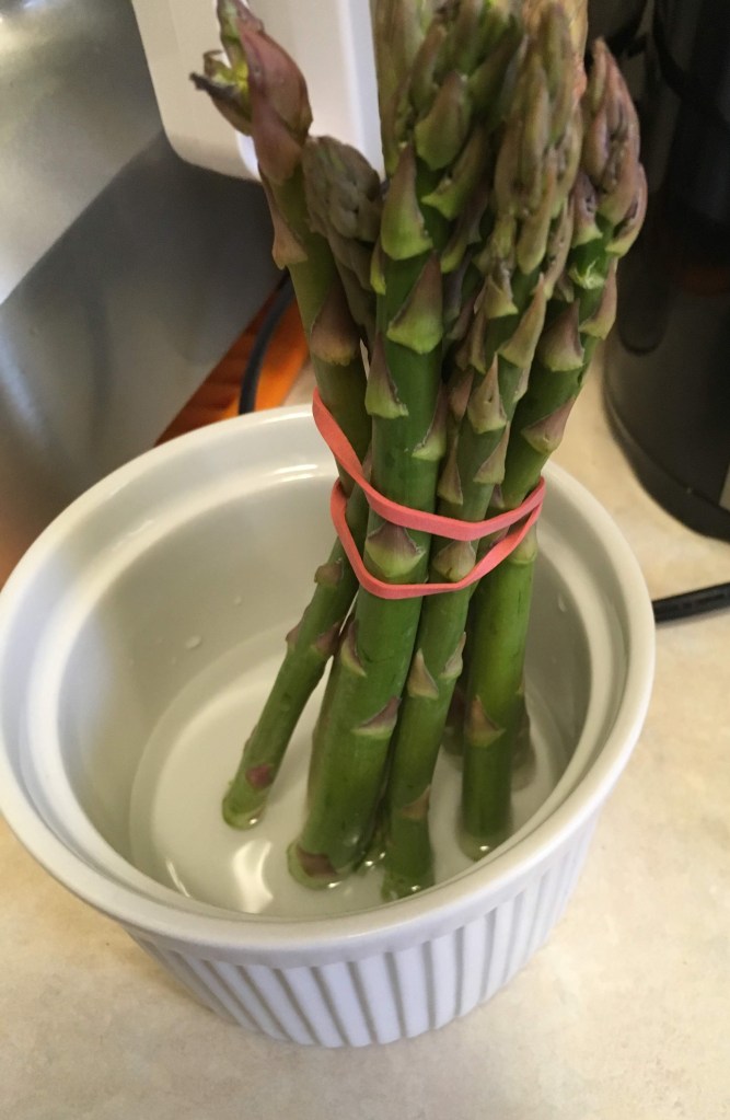 place the bottom tips of asparagus in some shallow water in a steady/heavy bowl or ramekin. keep the rubber band they came in so they don’t fall over.