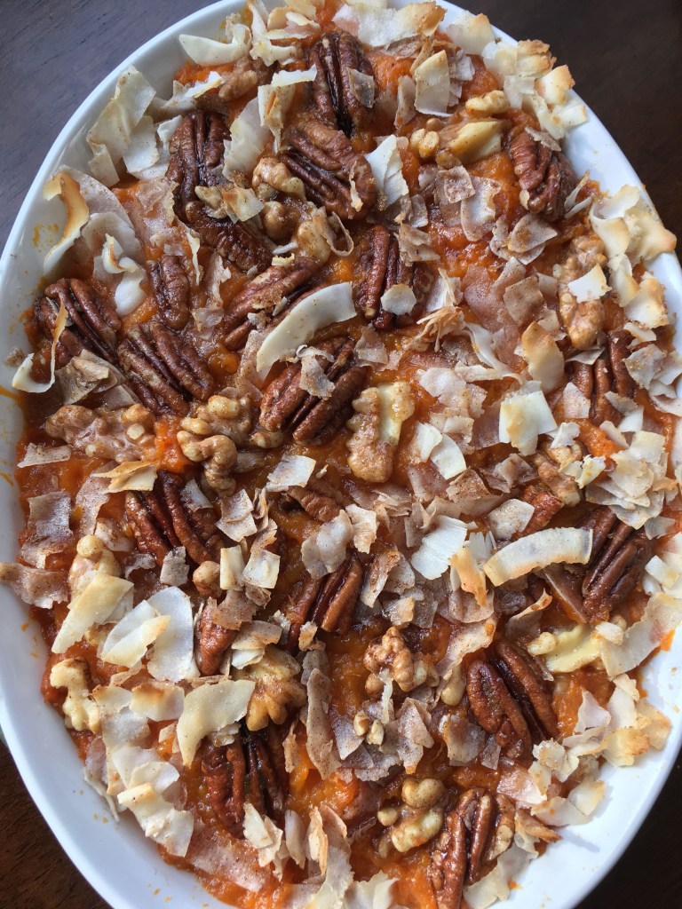 or a sweet potato casserole: maple pumpkin spice mashed sweet potatoes with toasted maple walnuts, pecans and coconut..practically a sweet potato pie dessert, but it’s a refined sugar free, dairy-free, gluten-free and a paleo side. Preced with pumpkin coconut soup or squash soup or pair with the honey glazed carrots below.