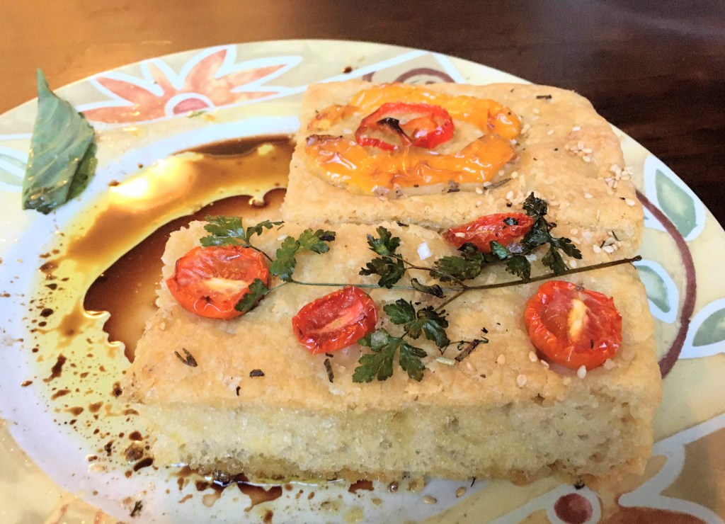 First during this quarantine bread craze, let us start with this easy quick no knead focaccia bread, which can be decorated with toppings to make a Garden focaccia art, a perfect comfort food year round; focaccia is great to pair with summer grilling, dip into balsamic olive oil or marinara as a starter, or have some of this decorated focaccia with a soup or salad. great dish for italian night to precede some basil pesto pasta perhaps (pesto recipe below).