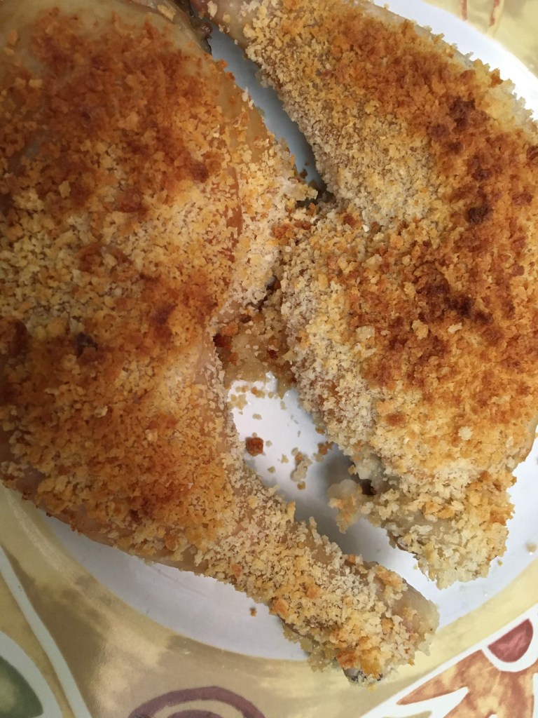Mix together the crumbs and sesoning. Cover the chicken skin with bread crumbs. place on a broiler pan with a grid or a small aluminum roasting rack over a pan for roasting chicken. Bake until the breaded skin is golden brown and crispy and the chicken is cooked through, about 40 minutes or so.