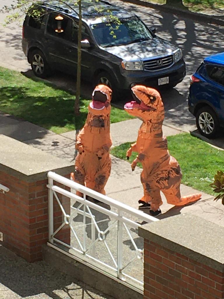 These two surprised their friend for her Brithday, in full dinosaur attire! I wonder if they do their pandemic grocery shopping in thsoe costumes too.. 😛 how I love my neighbors in quarantine days!