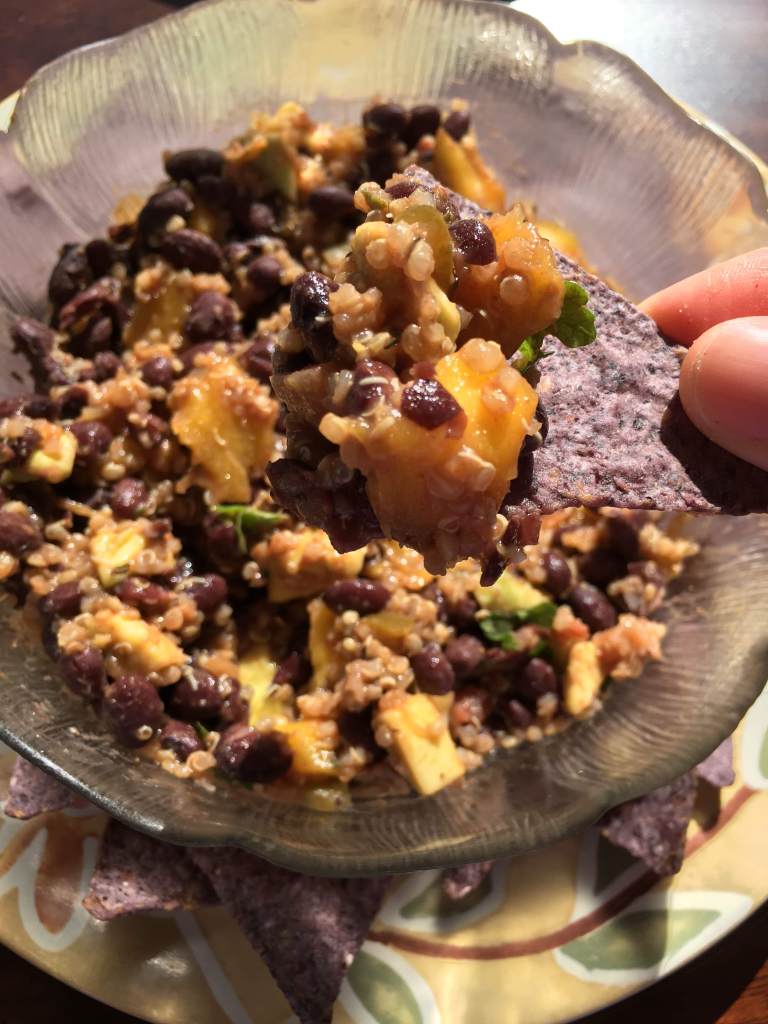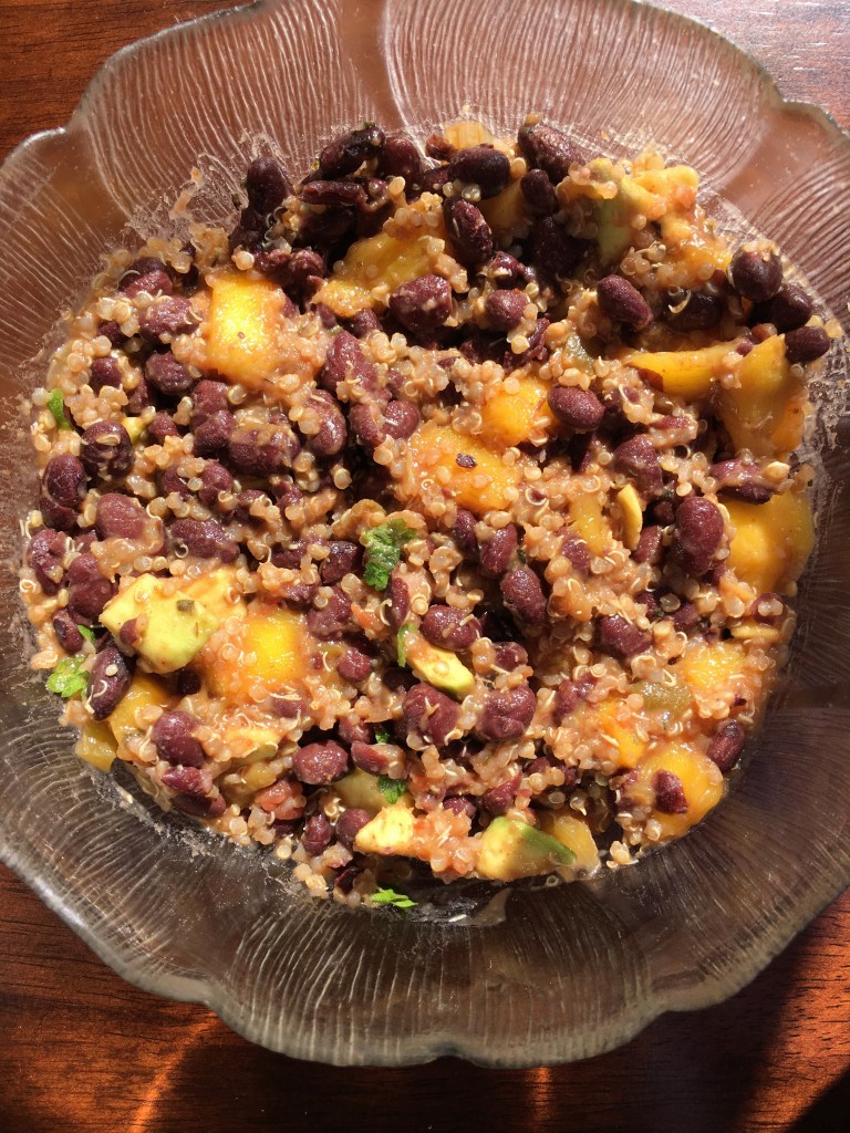 Taste test. Adjust seasoning and salt to taste. Stir in lime juice, cooked quinoa, mango, avocado, oil and cilantro. Adjust seasoning and salt to taste, stir and serve as a salad bowl or in wraps or with nachos.