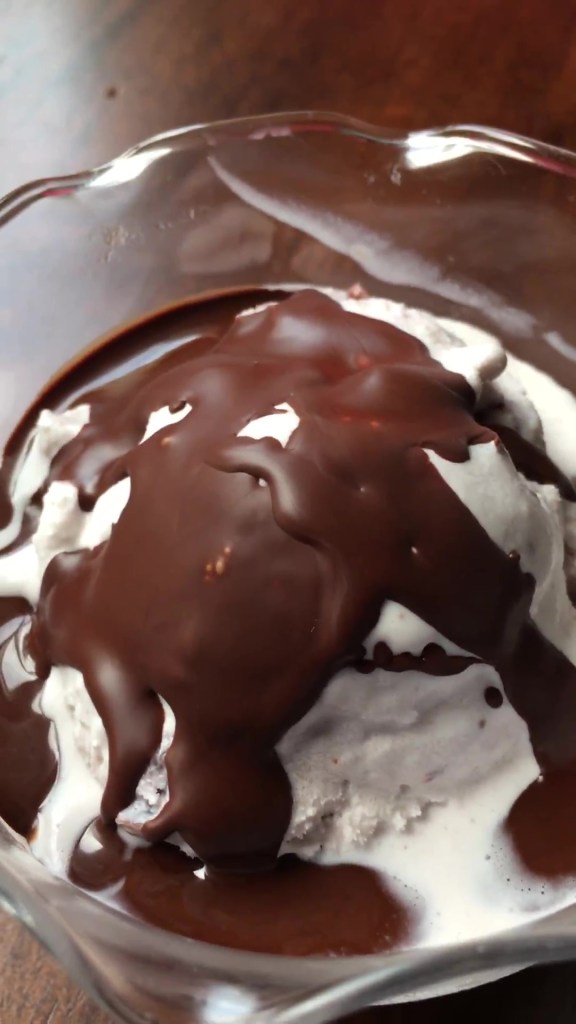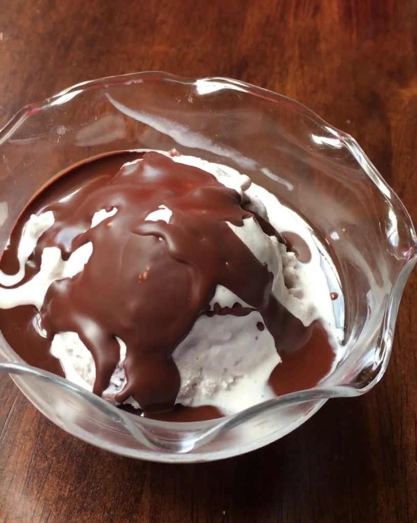 Melt coconut oil in saucepan over low med heat and mix in chocolate, stir and melt until smooth. Let cool slightly for approx ten min or less so it doesnt melt your ice cream, though thats a good look too!