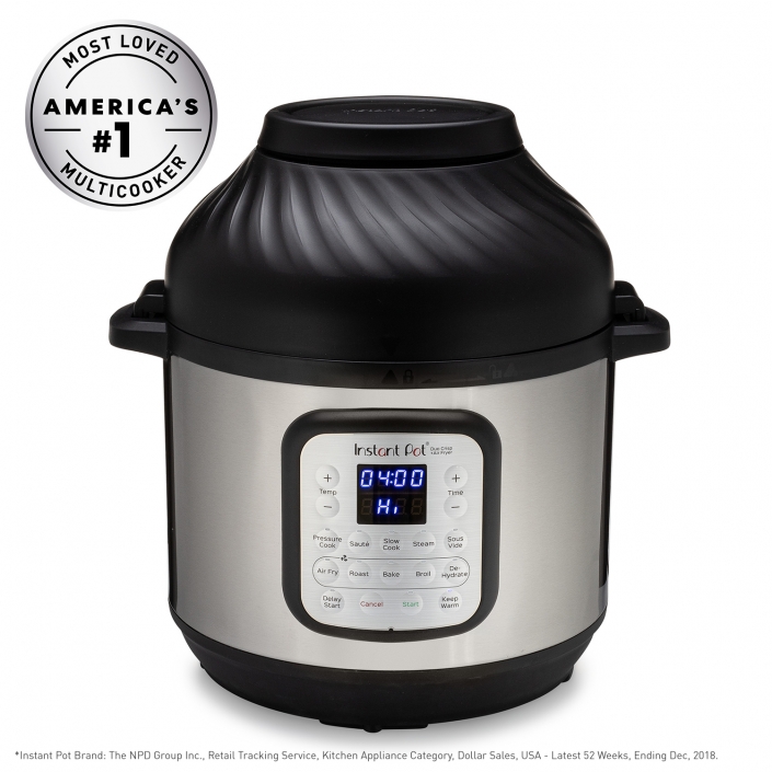 Instant Pot air fryer lid to turn your regular Instant Pot into an air fryer, dehydrator and roaster without needing a seperate appliance such as the Instant Pot Vortex air fryer. But for those with a family Instant Pot has also designed the 11 in 1 Omni toaster oven air fryer and roaster, perfect for families with kitchen space whose oven is preoccupied with makings ribs, baking bread etc. This acts as second oven and much more. It can roast a whole chicken (with convection and rotate features for perfect roasts), bake a large pizza, make a cake or slow cook. It also makes healthy fries in the air fryer mode and serves as a dehydrator for dehydrating apple chips etc. And it can proof bread. The Instant Pot brand has really proven itself in huge versatility matched with equal quality.