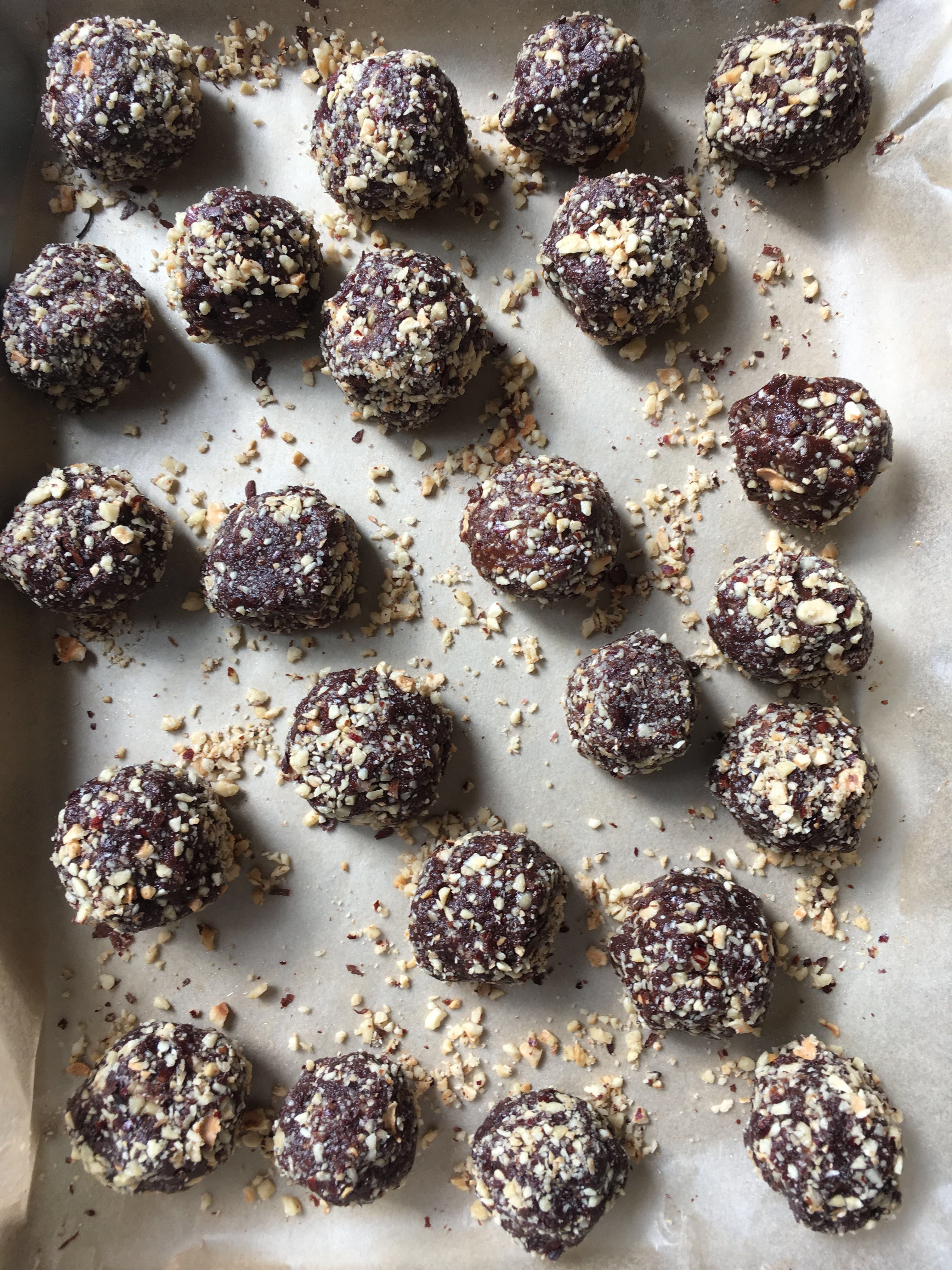 - Prep reserved crumbled hazelnuts on a parchment paper lined or nonstick large rectangular cake pan. Use a melon baller or teaspoon and your hands (more messy with warm hands) to scoop and add a hazelnut to the centre then add more mixture to close the truffle (don’t skip this, this creates the Ferrero Rocher experience though it is a date ball!). then roll in crumbled hazelnuts. repeat with all. Don’t worry they will no longer be gooey once finished.