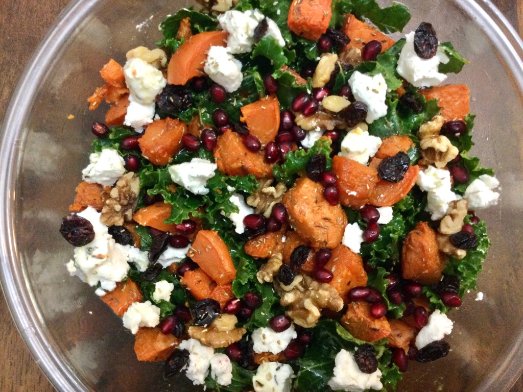 Add yams and onions to a glass lasagna pan. cover yams in in lots olive oil (be generous as the oil will be the herb infused dressing so there should be about a 2 cm layer of oil) and herbs and salt. bake 45 min or until tender.