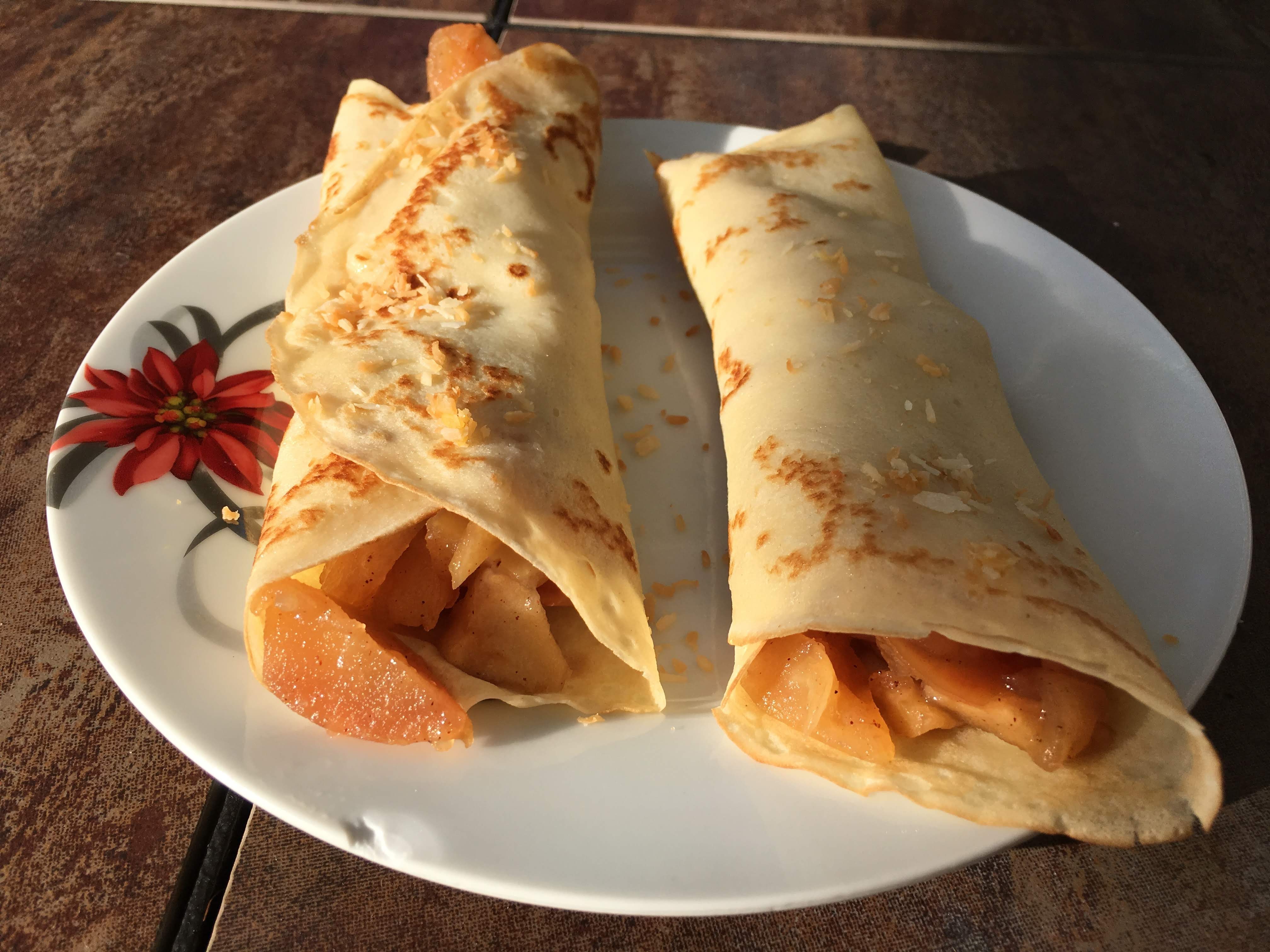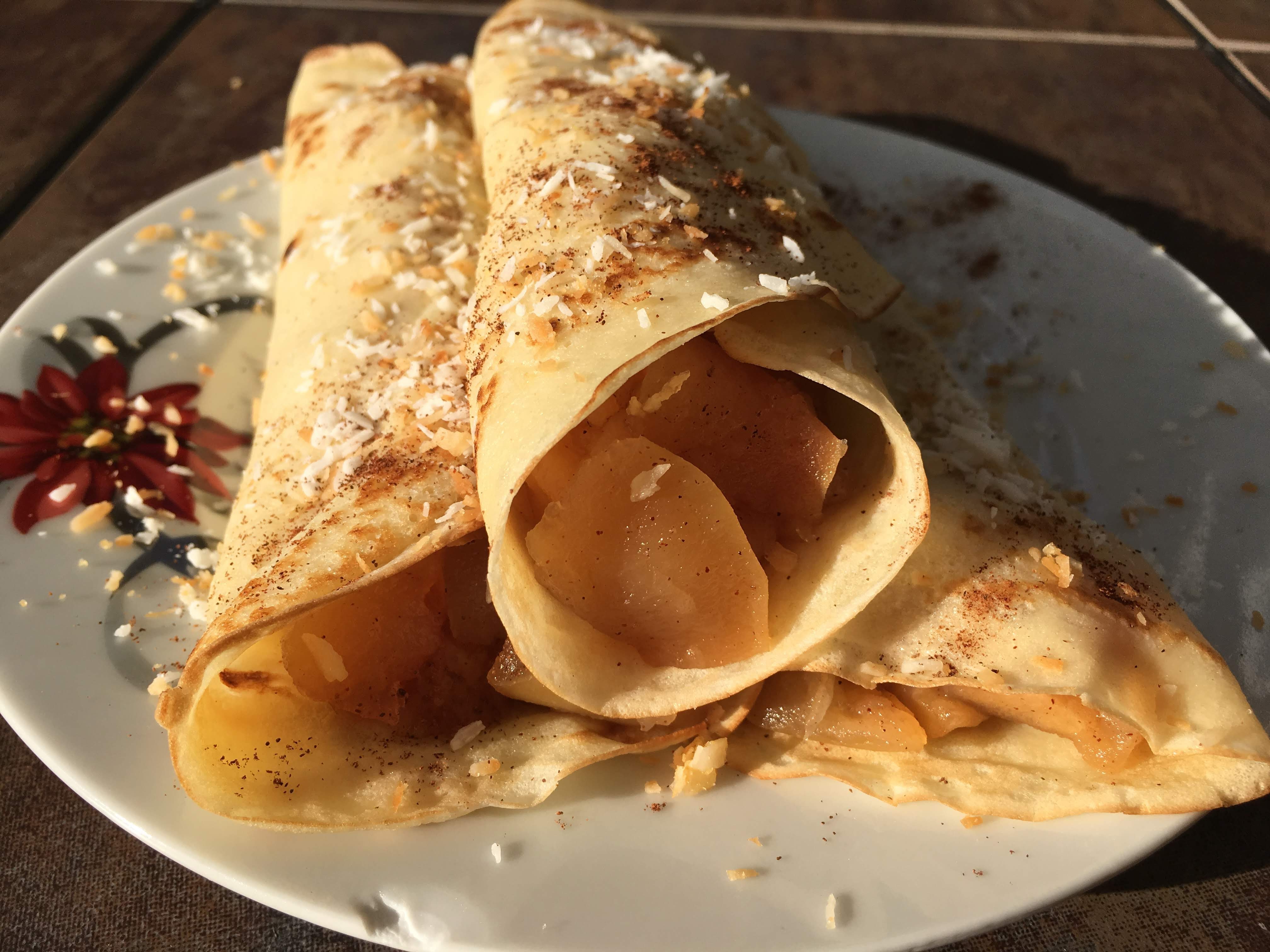 Place apples in a small pot and cover in very generous sugar and cinnamon. Cook on low. stir often to prevent burning, until apples release their juices. Cook on low, stirring from time to time, about 30min or until tender. if you are patient cook it longer to dissolve further into apple sauce. but we were hungry and prefer it in apple chunks! Fill and roll the crepes, dust with cinnamon and toasted coconut