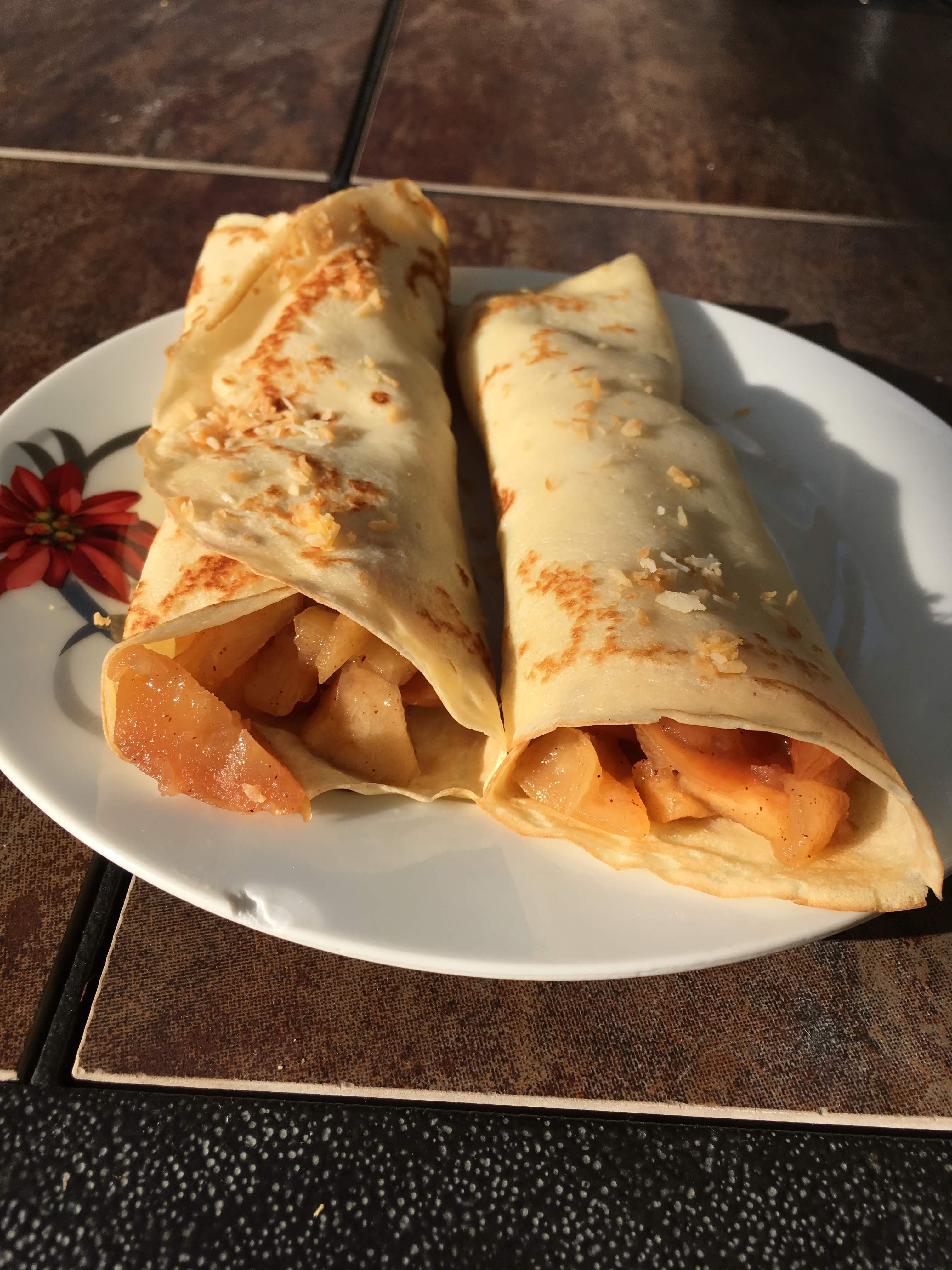 Crepes are all about the filling. Fill with fresh apple sauce as in recipe below or with jam or with nutella and banana/strawberry slices.