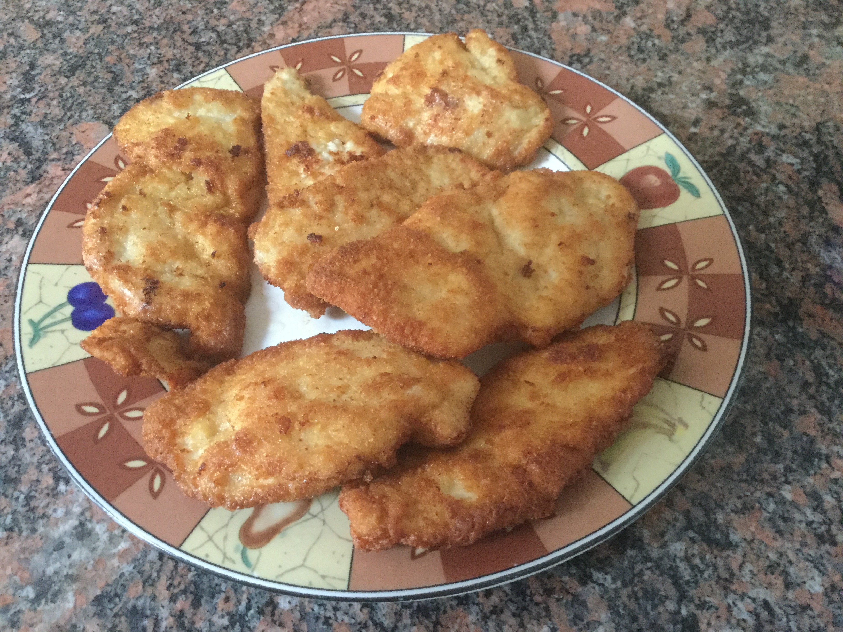 If using regular (not fast-fry) pork chops, trim them of fat and cut into 1/2” thick cutlets (they need to be made thinner so depending ont he thickness, cut it into two or three rounds). If using chicken breast, cut so it is a cm or less thick. Chop the chicken breasts in natural way, there’s a smaller flap etc. the pieces don’t need to be same size, they will be roughly same thickness. They will expand a bit once pounded so don’t be afraid of small pieces (some are approx 1.5”by 2.5-3” but it’s hard to give a number and each piece varies and isn’t wasted, small pieces are tasty as schnitzel chicken nuggets or tenders too!)