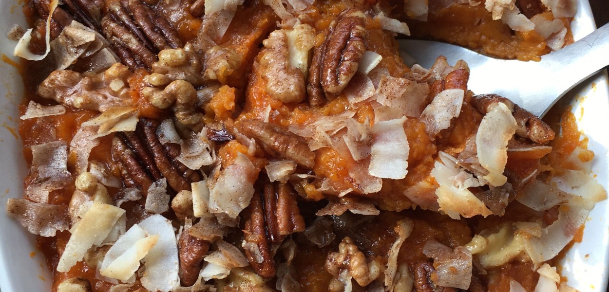 you will love this pumpkin spice sweet potato pie-like sweet potato casserole take on mashed yams/sweet potatoes for a great Thanksgiving and holiday side. Its topped with toasted coconut flakes and roasted maple walnuts and pecans- delish!