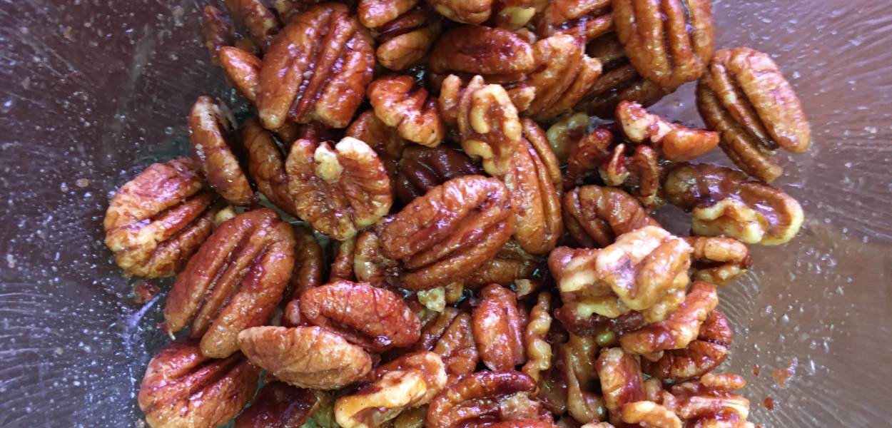 This simple holiday and year round snack recipe for maple caramelized nuts is made with coconut oil instead of butter so its dairy free yet delicious. you can use all pecans (my fave) or a mix of walnuts and pecans. Its as easy as tossing and roasting for a few minutes! Perfect for last minute Thanksgiving and Christmas holiday potlucks and entertaining.