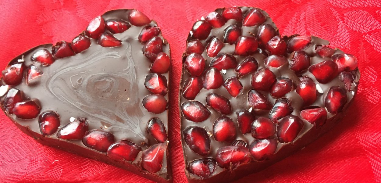 Be Mine bejewelled hearts! Valentine’s Day chocolate hearts recipe for a thoughtful V-Day gift for your Valentine. Or they can be made as square pomegranate chocolate bark around Christmas time for a festive recipe or as fun kids food crafts.